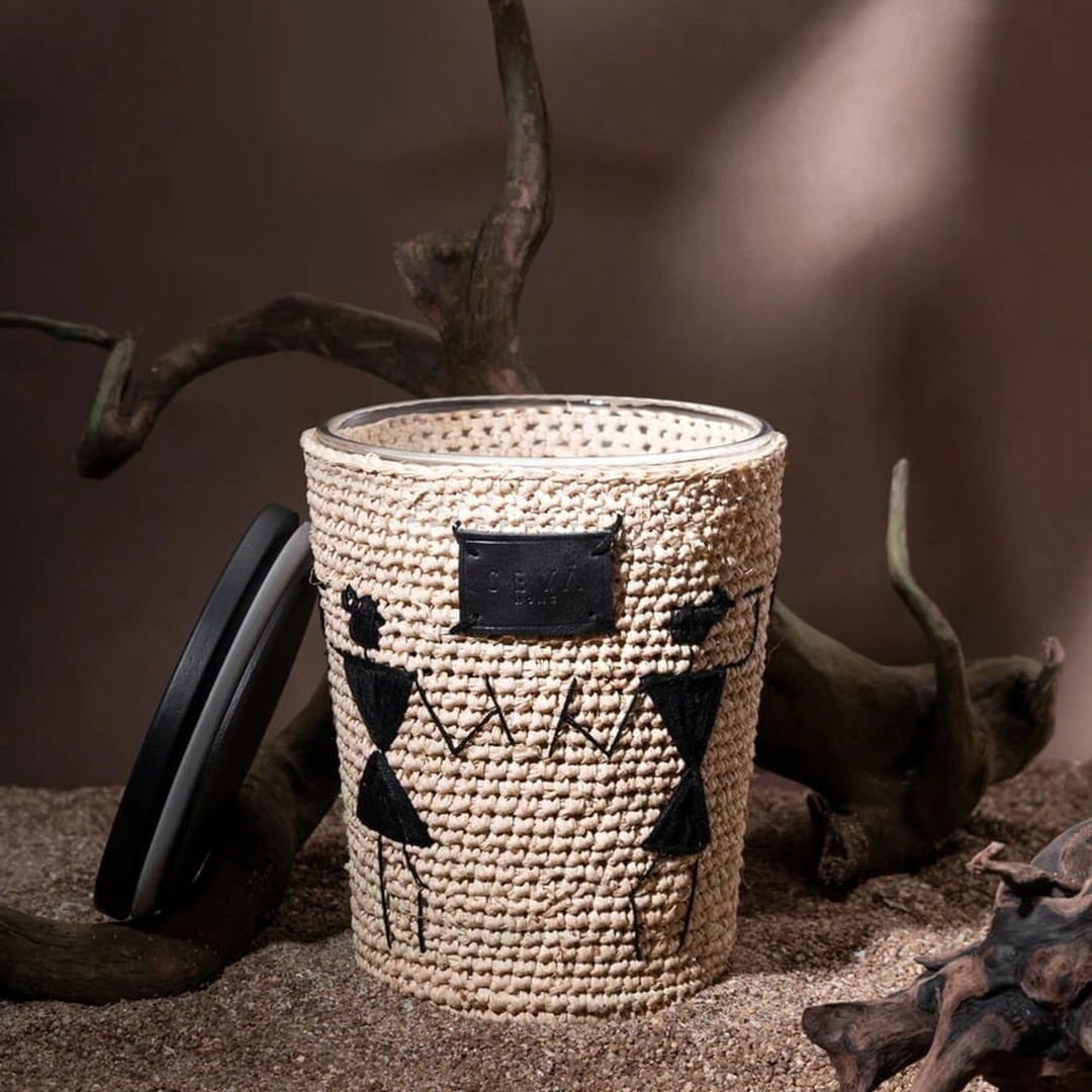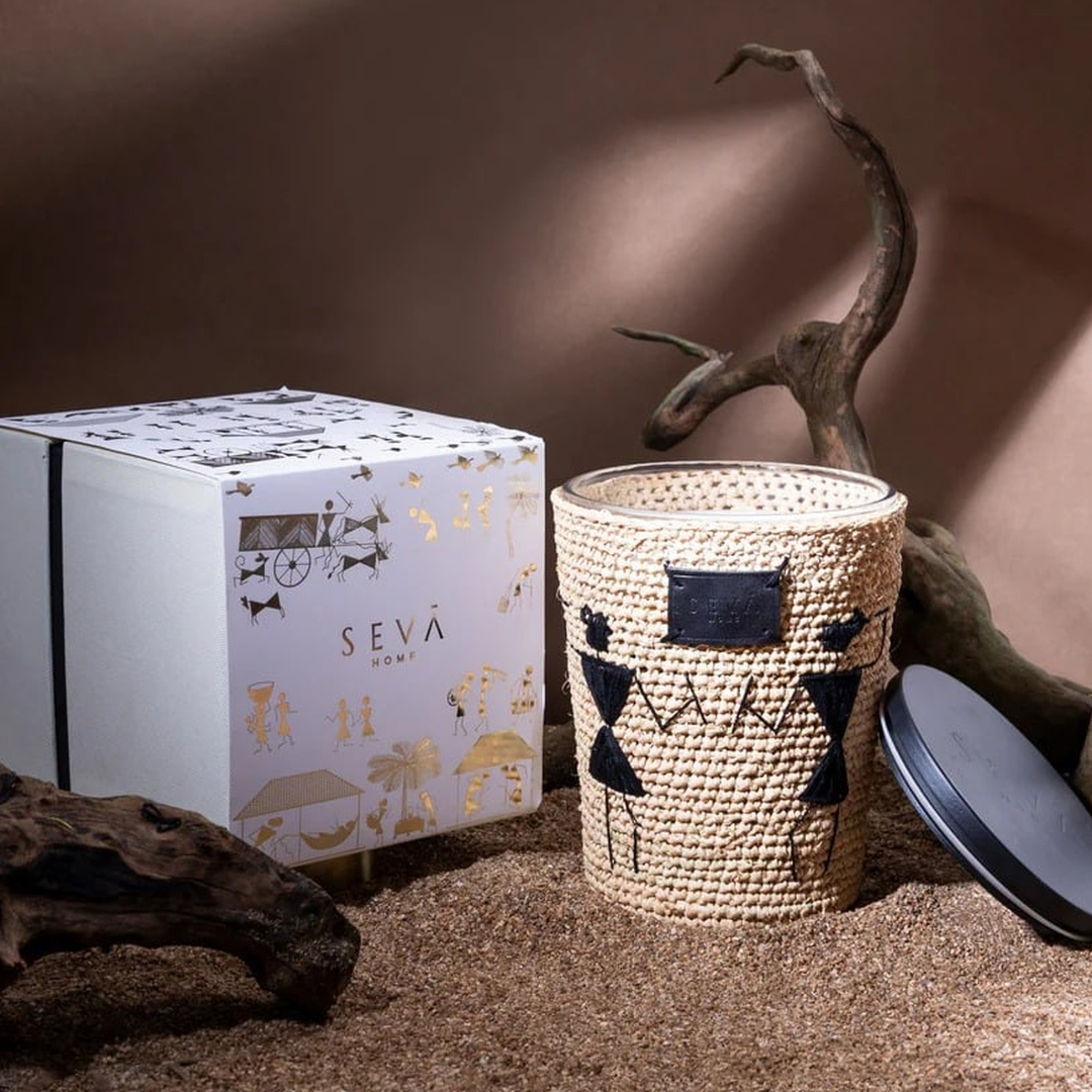 From the heart of the Indian forest, Seva Home proudly presents an exquisite addition to our Avante Garde Collection. Each contemporary glass jar is adorned with a hand-woven sleeve featuring Warli tribal art crafted from natural raffia material, transforming this candle into a stunning piece of art that merges modern with tradition . More than just a candle, it's a woven masterpiece that illuminates your home with lush fragrances of mandarins, orange flowers, vanilla, jasmine, sandalwood, and amber. Bring the essence of nature into your living space and light up your world with artistry and aroma.