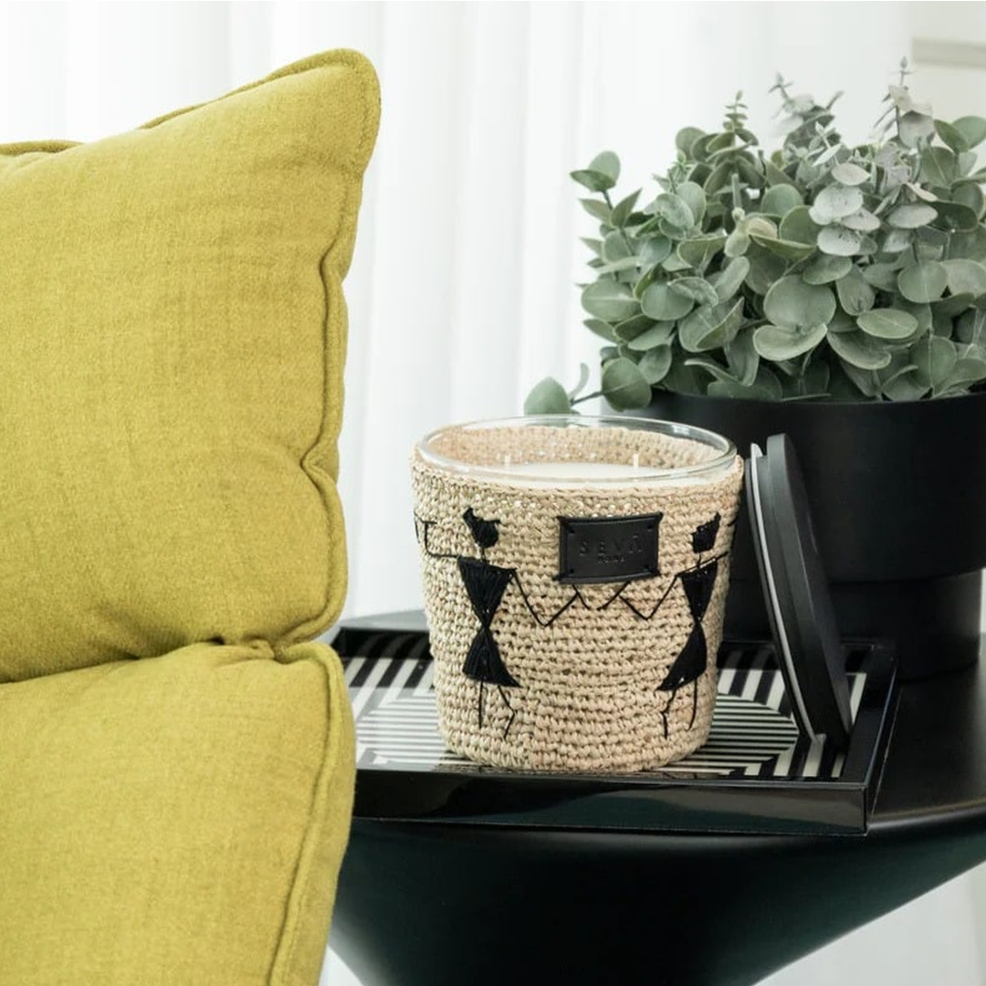 From the heart of the Indian forest, Seva Home proudly presents an exquisite addition to our Avante Garde Collection. Each contemporary glass jar is adorned with a hand-woven sleeve featuring Warli tribal art crafted from natural raffia material, transforming this candle into a stunning piece of art that merges modern with tradition . More than just a candle, it's a woven masterpiece that illuminates your home with lush fragrances of mandarins, orange flowers, vanilla, jasmine, sandalwood, and amber. Bring the essence of nature into your living space and light up your world with artistry and aroma.