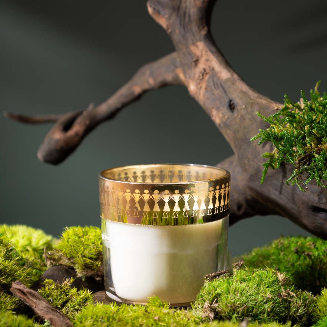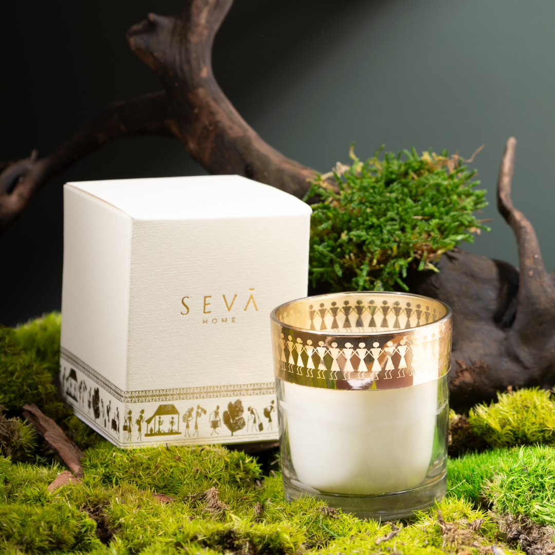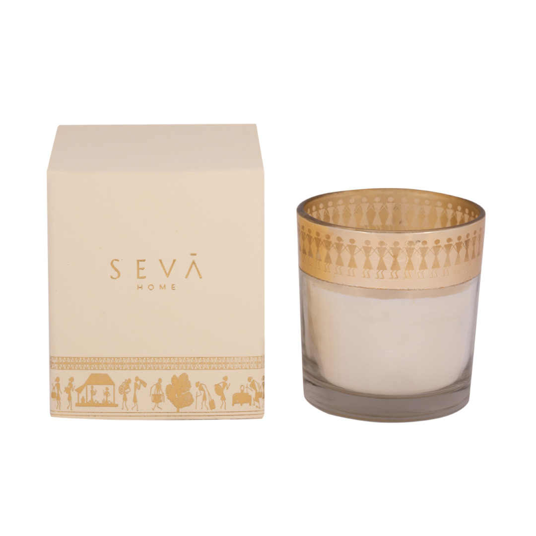 Illuminate your space with the enriched Enchante Candle Collection from Seva Home, a tribute to the vibrant life of the Warli tribe. Available individually or as a set of three, each candle showcases a unique Warli art design: the bustling lifestyle, the rhythmic tarpa dance, and the harmonious beauty of birds. Let the warm glow and rich culture of the Warli tribe light up your home.
