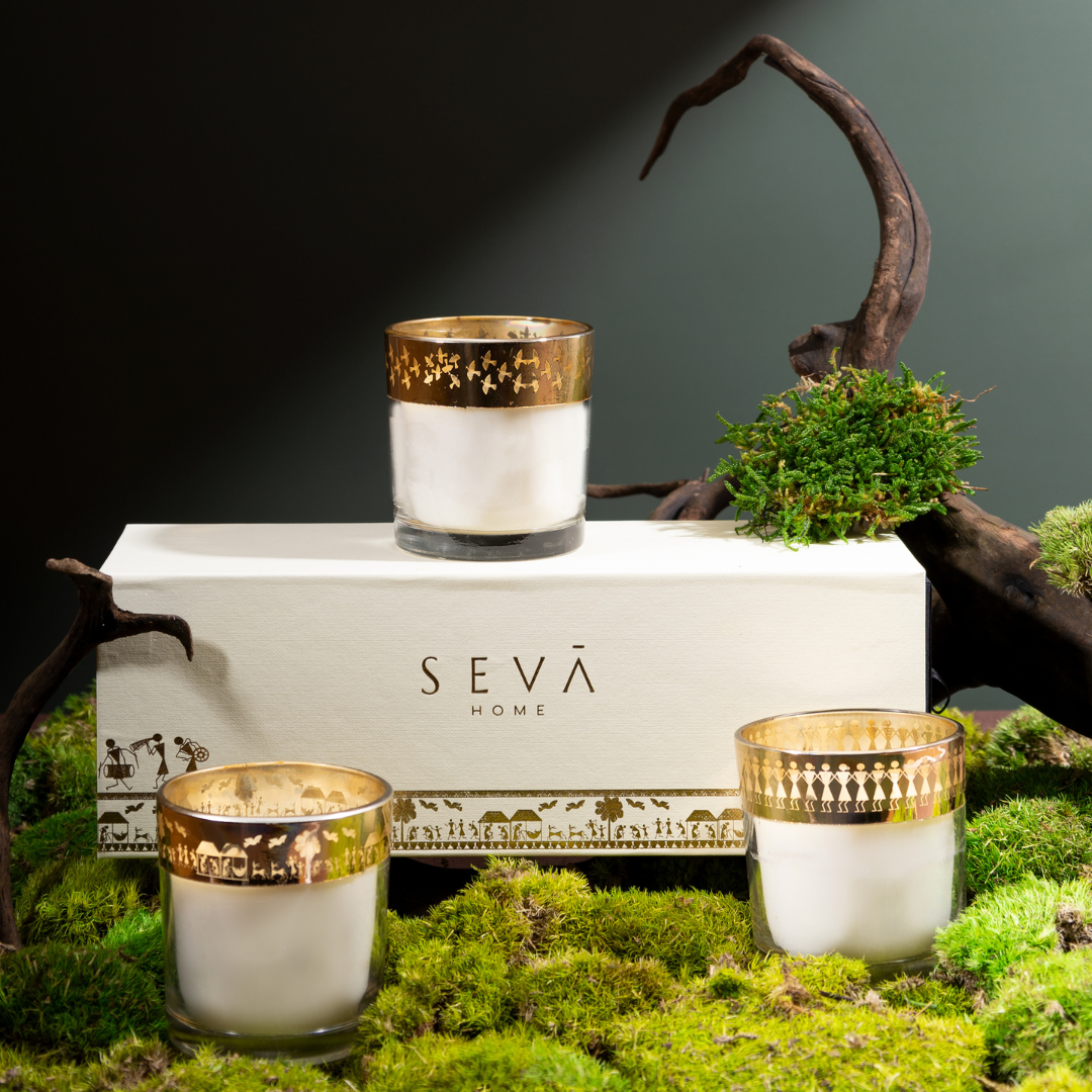 Illuminate your space with the enriched Enchante Candle Collection from Seva Home, a tribute to the vibrant life of the Warli tribe. Available individually or as a set of three, each candle showcases a unique Warli art design: the bustling lifestyle, the rhythmic tarpa dance, and the harmonious beauty of birds. Let the warm glow and rich culture of the Warli tribe light up your home.